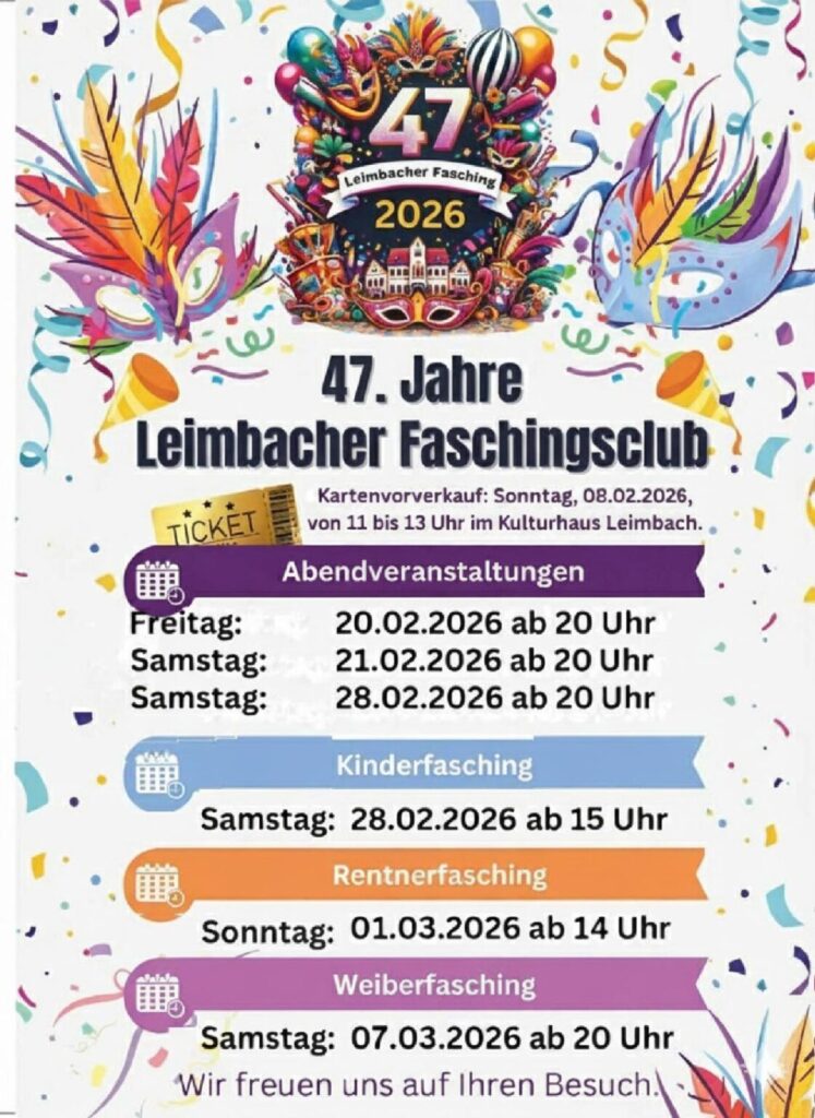 Sichert Euch schon jetzt Eure Karten unter 0170 8035365 oder beim Kartenvorverkauf am So. 08.02.2025 von 11 – 13 Uhr im Kulturhaus Leimbach.